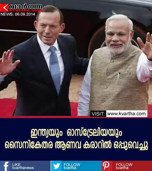 ഡെല്ഹി: (www.kvartha.com 06.09.2014)ഇന്ത്യയും ഓസ്ട്രേലിയയും തമ്മില് സൈനികേതര ആണവ കരാറില് ഒപ്പുവെച്ചു. പ്രധാനമന്ത്രി നരേന്ദ്ര മോഡിയും ഓസ്ട്രേലിയന് പ്രധാനമന്ത്രി ടോണി അബോട്ടും നടത്തിയ കൂടിക്കാഴ്ചയിലാണ് സൈനികേതര ആണവകരാറില് ഒപ്പുവെച്ചത്. ഇതിനു പുറമെ വാണിജ്യം, പ്രതിരോധം, വിദ്യാഭ്യാസം, കായികം തുടങ്ങിയ മേഖലകളിലും ഇരു രാജ്യങ്ങളും സഹകരിച്ച് പ്രവര്ത്തിക്കാന് തീരുമാനിച്ചിട്ടുണ്ട്.