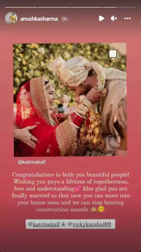 നവദമ്പതികളെ അനുമോദിക്കുന്നതിനൊപ്പം, തന്റെ പുതിയ അയല്ക്കാരാണ് ഇവര് എന്നും അനുഷ്ക പറയുന്നു. ഇന്സ്റ്റഗ്രാം സ്റ്റോറിയിലാണ് അനുഷ്ക ഈ കാര്യം അറിയിച്ചത്. കത്രീനയുടെയും വികിയുടെയും പുതിയ വിവാഹ ചിത്രവും അനുഷ്ക പങ്കുവച്ചിട്ടുണ്ട്.