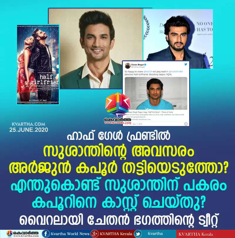 ഹാഫ് ഗേള് ഫ്രണ്ടില് സുശാന്തിന്റെ അവസരം അര്ജുന് കപൂര് തട്ടിയെടുത്തോ? എന്തുകൊണ്ട് സുശാന്തിന് പകരം കപൂറിനെ കാസ്റ്റ് ചെയ്തു? വൈറലായി ചേതന് ഭഗത്തിന്റെ ട്വീറ്റ്