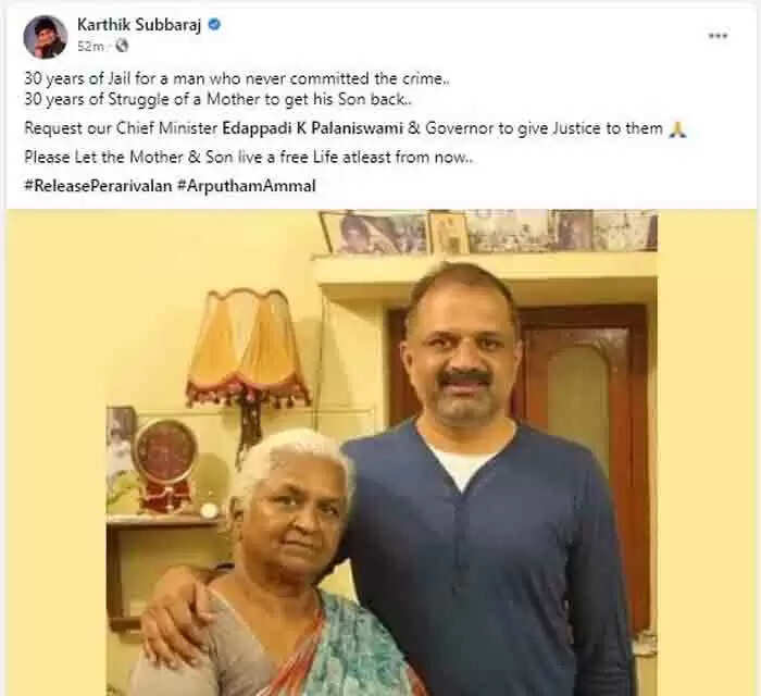 ഇരുവര്‍ക്കും നീതി ലഭ്യമാക്കാന്‍ തമിഴ്നാട് മുഖ്യമന്ത്രി എടപ്പാടി പളനിസ്വാമിയോടും ഗവര്‍ണറോടും ആവശ്യപ്പെടുകയാണെന്നും കാര്‍ത്തിക് പറഞ്ഞു. ഇനിയെങ്കിലും അമ്മയെയും മകനെയും സ്വതന്ത്രമായി ജീവിക്കാന്‍ അനുവദിക്കണമെന്നും അദ്ദേഹം ആവശ്യപ്പെട്ടിട്ടുണ്ട്. പേരറിവാളനും അമ്മയും ഒന്നിച്ചുനില്‍ക്കുന്ന ചിത്രം പങ്കുവച്ചാണ് കാര്‍ത്തിക് ഇക്കാര്യങ്ങള്‍ ആവശ്യപ്പെട്ടിരിക്കുന്നത്. രാജീവ് ഗാന്ധി വധക്കേസ് പ്രതി പേരറിവാളനെ മോചിപ്പിക്കണമെന്ന് സംവിധായകന്‍ കാര്‍ത്തിക് സുബ്ബരാജ്; തെറ്റ് ചെയ്യാത്ത ഒരാള്‍ മുപ്പത് വര്‍ഷമായി ജയിലില്‍ കഴിയുന്നു; മകനെ തിരിച്ചുകിട്ടാന്‍ ഒരമ്മ 30 വര്‍ഷമായി പോരാടുന്നു; ഇനിയെങ്കിലും അമ്മയെയും മകനെയും സ്വതന്ത്രമായി ജീവിക്കാന്‍ അനുവദിക്കണമെന്നും ആവശ്യം