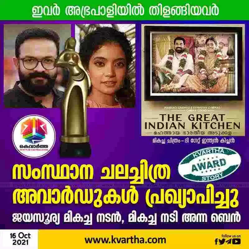 Keywords: Kerala Film Awards declared: Jayasurya is best actor, Anna Ben best actress, Kochi, News, Cinema, Award, Actress, Actor, Entertainment, Kerala.