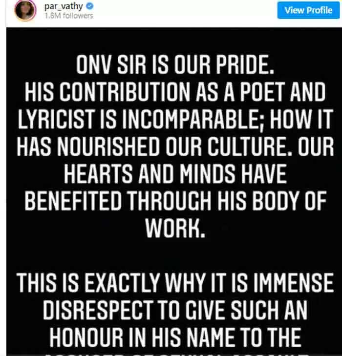 കൊച്ചി: (www.kvartha.com 27.05.2021) മലയാളത്തിന്റെ പ്രിയ കവി ഒഎന്വി കുറിപ്പിന്റെ പേരിലുള്ള അവാര്ഡ് ഇത്തവണ തമിഴ് സാഹിത്യകാരനും ഗാനരചയിതാവുമായ വൈരമുത്തുവിനാണ് ലഭിച്ചത്. അതിനിടെ വൈര മുത്തുവിന് അവാര്ഡ് നല്കിയതിനെതിരെ പ്രതിഷേധവുമായി മലയാളികളുടെ പ്രിയ താരമായ നടി പാര്വതി തിരുവോത്ത് രംഗത്ത്.