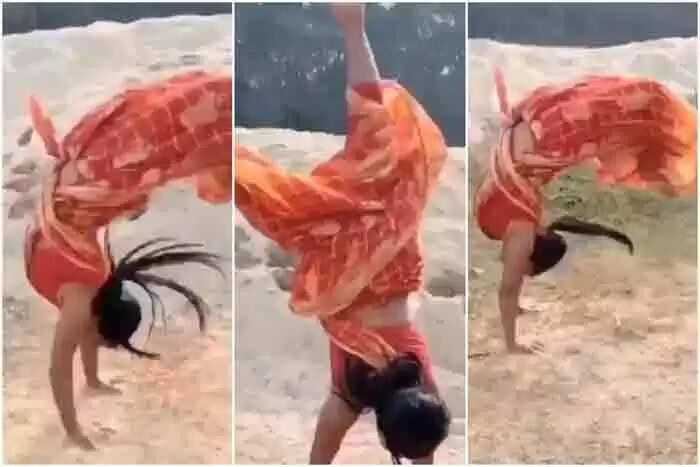 സാരിയുടുത്ത് തലകുത്തി മറിഞ്ഞ് യുവതി; ഒരുതവണയല്ല, നിരവധി പ്രാവശ്യം; വിഡിയോ കണ്ട് അമ്പരന്ന് സോഷ്യല് മീഡിയ