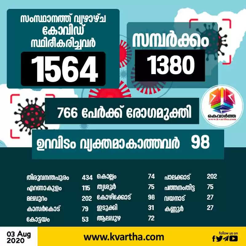 തിരുവനന്തപുരം: (www.kvartha.com 13.08.2020) സംസ്ഥാനത്ത് വ്യാഴാഴ്ച കോവിഡ് സ്ഥിരീകരിച്ചത് 1564 പേര്‍ക്ക്.  കഴിഞ്ഞദിവസം 1212 പേര്‍ക്കായിരുന്നു കോവിഡ് സ്ഥിരീകരിച്ചത് .