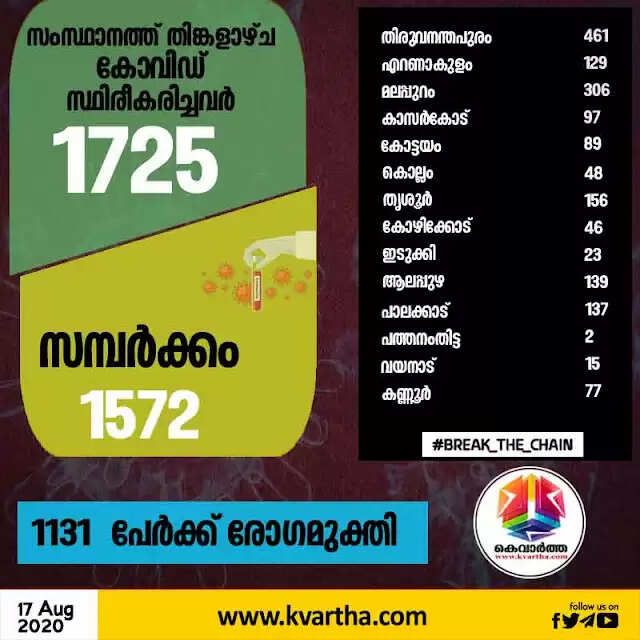 തിരുവനന്തപുരം ജില്ലയിലെ 435 പേര്ക്കും, മലപ്പുറം ജില്ലയിലെ 285 പേര്ക്കും, തൃശൂര് ജില്ലയിലെ 144 പേര്ക്കും, പാലക്കാട് ജില്ലയിലെ 124 പേര്ക്കും, എറണാകുളം 123 ജില്ലയിലെ പേര്ക്കും, ആലപ്പുഴ ജില്ലയിലെ 122 പേര്ക്കും, കാസര്കോട് ജില്ലയിലെ 90 പേര്ക്കും, കോട്ടയം ജില്ലയിലെ 81 പേര്ക്കും, കണ്ണൂര് ജില്ലയിലെ 61 പേര്ക്കും, കൊല്ലം ജില്ലയിലെ 45 പേര്ക്കും, കോഴിക്കോട് ജില്ലയിലെ 33 പേര്ക്കും, ഇടുക്കി ജില്ലയിലെ 14 പേര്ക്കും, വയനാട് ജില്ലയിലെ 13 പേര്ക്കും, പത്തനംതിട്ട ജില്ലയിലെ 2 പേര്ക്കുമാണ് ഇന്ന് സമ്പര്ക്കത്തിലൂടെ രോഗം ബാധിച്ചത്.