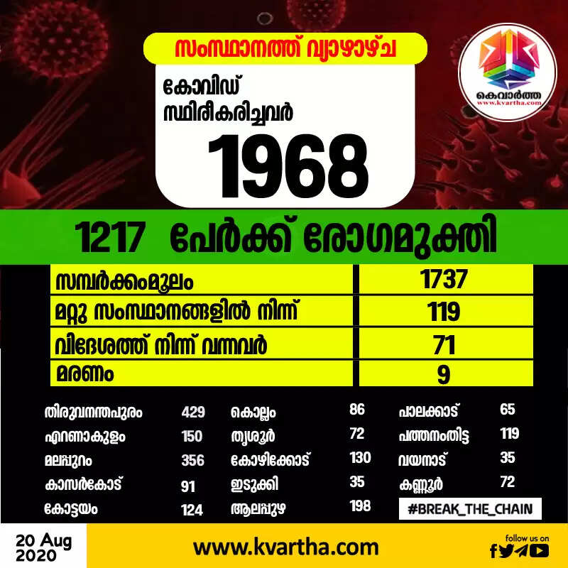 വ്യാഴാഴ്ച രോഗം സ്ഥിരീകരിച്ചവരില് 71 പേര് വിദേശ രാജ്യങ്ങളില് നിന്നും 109 പേര് മറ്റ് സംസ്ഥാനങ്ങളില് നിന്നും വന്നതാണ്. 1737 പേര്ക്ക് സമ്പര്ക്കത്തിലൂടെയാണ് രോഗം ബാധിച്ചത്. അതില് 100 പേരുടെ സമ്പര്ക്ക ഉറവിടം വ്യക്തമല്ല. തിരുവനന്തപുരം ജില്ലയിലെ 394 പേര്ക്കും, മലപ്പുറം ജില്ലയിലെ 328 പേര്ക്കും, ആലപ്പുഴ ജില്ലയിലെ 182 പേര്ക്കും, എറണാകുളം ജില്ലയിലെ 138 പേര്ക്കും, കോട്ടയം ജില്ലയിലെ 115 പേര്ക്കും, കോഴിക്കോട് ജില്ലയിലെ 108 പേര്ക്കും, പത്തനംതിട്ട ജില്ലയിലെ 95 പേര്ക്കും, കൊല്ലം, കാസര്ഗോഡ് ജില്ലകളിലെ 79 പേര്ക്ക് വീതവും, തൃശൂര് ജില്ലയിലെ 67 പേര്ക്കും, കണ്ണൂര് ജില്ലയിലെ 66 പേര്ക്കും, പാലക്കാട് ജില്ലയിലെ 34 പേര്ക്കും, ഇടുക്കി ജില്ലയിലെ 29 പേര്ക്കും, വയനാട് ജില്ലയിലെ 23 പേര്ക്കുമാണ് വ്യാഴാഴ്ച സമ്പര്ക്കത്തിലൂടെ രോഗം ബാധിച്ചത്.