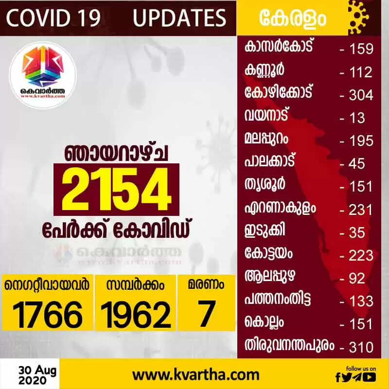 ഞായറാഴ്ച രോഗം സ്ഥിരീകരിച്ചവരില് 49 പേര് വിദേശ രാജ്യങ്ങളില് നിന്നും 110 പേര് മറ്റ് സംസ്ഥാനങ്ങളില് നിന്നും വന്നതാണ്. 1962 പേര്ക്ക് സമ്പര്ക്കത്തിലൂടെയാണ് രോഗം ബാധിച്ചത്. അതില് 174 പേരുടെ സമ്പര്ക്ക ഉറവിടം വ്യക്തമല്ല. തിരുവനന്തപുരം ജില്ലയില് നിന്നുള്ള 305 പേര്ക്കും, കോഴിക്കോട് ജില്ലയില് നിന്നുള്ള 292 പേര്ക്കും, കോട്ടയം ജില്ലയില് നിന്നുള്ള 212 പേര്ക്കും, എറണാകുളം ജില്ലയില് നിന്നുള്ള 202 പേര്ക്കും, മലപ്പുറം ജില്ലയില് നിന്നുള്ള 184 പേര്ക്കും, തൃശൂര് ജില്ലയില് നിന്നുള്ള 145 പേര്ക്കും, കൊല്ലം ജില്ലയില് നിന്നുള്ള 142 പേര്ക്കും, കാസര്കോട് ജില്ലയില് നിന്നുള്ള 139 പേര്ക്കും, പത്തനംതിട്ട ജില്ലയില് നിന്നുള്ള 107 പേര്ക്കും, കണ്ണൂര് ജില്ലയില് നിന്നുള്ള 90 പേര്ക്കും, ആലപ്പുഴ ജില്ലയില് നിന്നുള്ള 88 പേര്ക്കും, പാലക്കാട് ജില്ലയില് നിന്നുള്ള 26 പേര്ക്കും, ഇടുക്കി ജില്ലയില് നിന്നുള്ള 23 പേര്ക്കും, വയനാട് ജില്ലയില് നിന്നുള്ള 7 പേര്ക്കുമാണ് ഞായറാഴ്ച സമ്പര്ക്കത്തിലൂടെ രോഗം ബാധിച്ചത്.