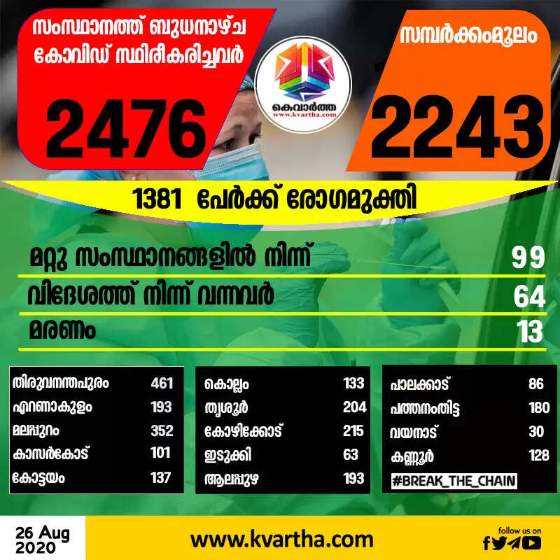 ബുധനാഴ്ച രോഗം സ്ഥിരീകരിച്ചവരില് 64 പേര് വിദേശ രാജ്യങ്ങളില് നിന്നും 99 പേര് മറ്റ് സംസ്ഥാനങ്ങളില് നിന്നും വന്നതാണ്. 2243 പേര്ക്ക് സമ്പര്ക്കത്തിലൂടെയാണ് രോഗം ബാധിച്ചത്. അതില് 175 പേരുടെ സമ്പര്ക്ക ഉറവിടം വ്യക്തമല്ല. തിരുവനന്തപുരം ജില്ലയില് നിന്നുള്ള 445 പേര്ക്കും, മലപ്പുറം ജില്ലയില് നിന്നുള്ള 332 പേര്ക്കും, കോഴിക്കോട് ജില്ലയില് നിന്നുള്ള 205 പേര്ക്കും, തൃശൂര് ജില്ലയില് നിന്നുള്ള 183 പേര്ക്കും, എറണാകുളം ജില്ലയില് നിന്നുള്ള 179 പേര്ക്കും, ആലപ്പുഴ ജില്ലയില് നിന്നുള്ള 164 പേര്ക്കും, പത്തനംതിട്ട ജില്ലയില് നിന്നുള്ള 145 പേര്ക്കും, കോട്ടയം ജില്ലയില് നിന്നുള്ള 134 പേര്ക്കും, കൊല്ലം ജില്ലയില് നിന്നുള്ള 131 പേര്ക്കും, കണ്ണൂര് ജില്ലയില് നിന്നുള്ള 111 പേര്ക്കും, കാസര്കോട് ജില്ലയില് നിന്നുള്ള 79 പേര്ക്കും, പാലക്കാട് ജില്ലയില് നിന്നുള്ള 64 പേര്ക്കും, ഇടുക്കി ജില്ലയില് നിന്നുള്ള 50 പേര്ക്കും, വയനാട് ജില്ലയില് നിന്നുള്ള 21 പേര്ക്കുമാണ് ഇന്ന് സമ്പര്ക്കത്തിലൂടെ രോഗം ബാധിച്ചത്.