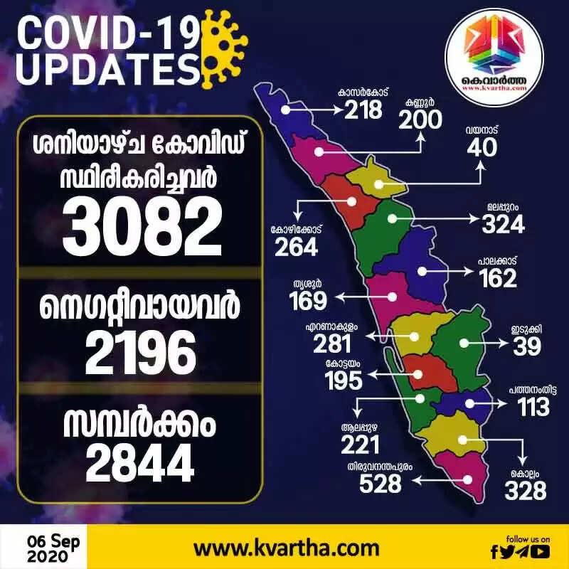 ഞായറാഴ്ച രോഗം സ്ഥിരീകരിച്ചവരില് 56 പേര് വിദേശ രാജ്യങ്ങളില് നിന്നും 132 പേര് മറ്റ് സംസ്ഥാനങ്ങളില് നിന്നും വന്നതാണ്. 2844 പേര്ക്ക് സമ്പര്ക്കത്തിലൂടെയാണ് രോഗം ബാധിച്ചത്. അതില് 189 പേരുടെ സമ്പര്ക്ക ഉറവിടം വ്യക്തമല്ല. തിരുവനന്തപുരം ജില്ലയില് നിന്നുള്ള 515 പേര്ക്കും കൊല്ലം ജില്ലയില് നിന്നുള്ള 302 പേര്ക്കും, മലപ്പുറം ജില്ലയില് നിന്നുള്ള 297 പേര്ക്കും, എറണാകുളം ജില്ലയില് നിന്നുള്ള 276 പേര്ക്കും, കോഴിക്കോട് ജില്ലയില് നിന്നുള്ള 253 പേര്ക്കും, കാസര്കോട് ജില്ലയില് നിന്നുള്ള 203 പേര്ക്കും, ആലപ്പുഴ ജില്ലയില് നിന്നുള്ള 200 പേര്ക്കും, കോട്ടയം ജില്ലയില് നിന്നുള്ള 190 പേര്ക്കും, കണ്ണൂര് ജില്ലയില് നിന്നുള്ള 169 പേര്ക്കും, തൃശൂര് ജില്ലയില് നിന്നുള്ള 157 പേര്ക്കും, പാലക്കാട് ജില്ലയില് നിന്നുള്ള 126 പേര്ക്കും, പത്തനംതിട്ട ജില്ലയില് നിന്നുള്ള 94 പേര്ക്കും, വയനാട് ജില്ലയില് നിന്നുള്ള 35 പേര്ക്കും, ഇടുക്കി ജില്ലയില് നിന്നുള്ള 27 പേര്ക്കുമാണ് ഞായറാഴ്ച സമ്പര്ക്കത്തിലൂടെ രോഗം ബാധിച്ചത്.