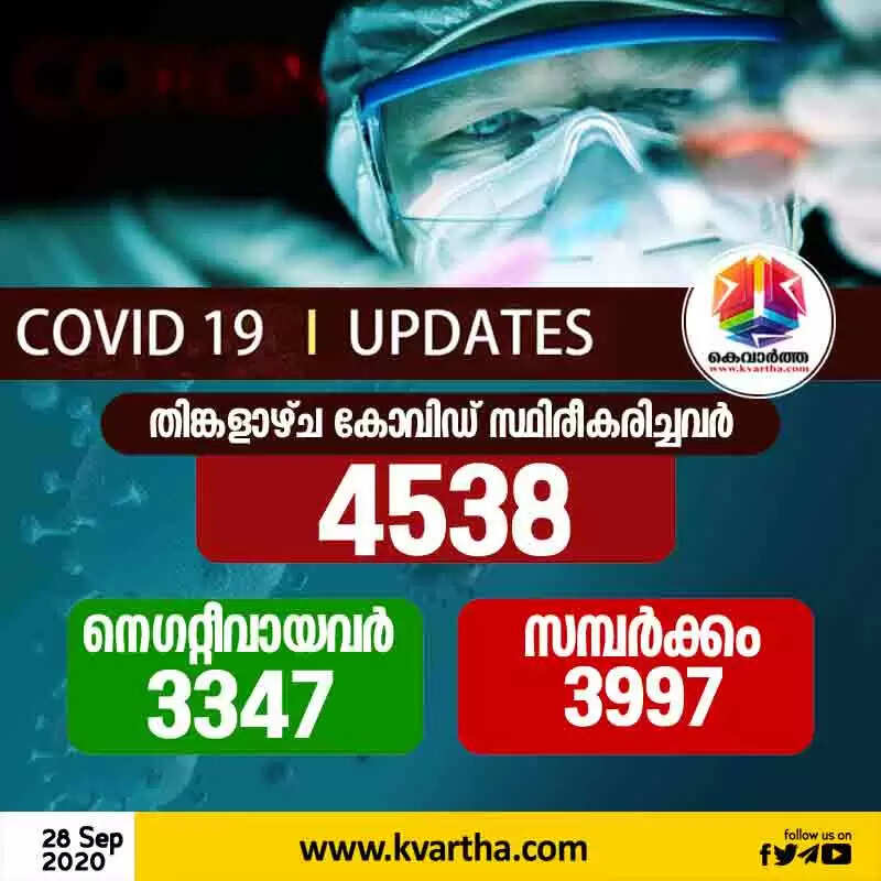 തിരുവനന്തപുരം: (www.kvartha.com28.09.2020) സംസ്ഥാനത്ത് തിങ്കളാഴ്ച കോവിഡ് സ്ഥിരീകരിച്ചത് 4538 പേര്ക്ക്. കഴിഞ്ഞദിവസം 7445 പേര്ക്കായിരുന്നു കോവിഡ് സ്ഥിരീകരിച്ചത്. 20 മരണം. മുഖ്യമന്ത്രി പിണറായി വിജയനാണ് ഇക്കാര്യം അറിയിച്ചത്.