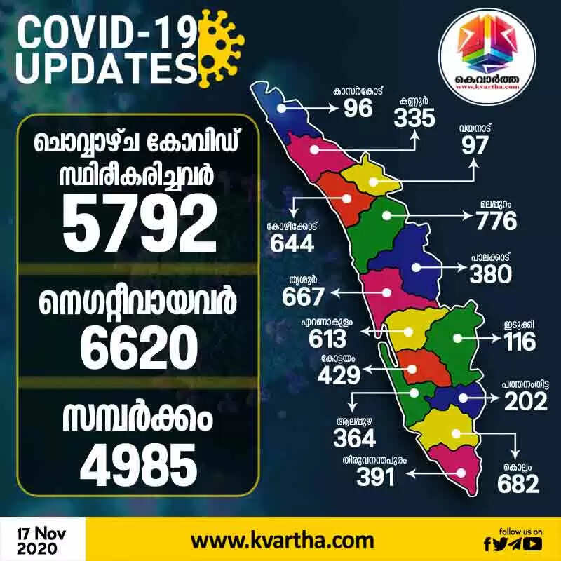 തിരുവനന്തപുരം: (www.kvartha.com 17.11.2020) സംസ്ഥാനത്ത് ചൊവ്വാഴ്ച കോവിഡ് സ്ഥിരീകരിച്ചത് 5792 പേര്‍ക്ക്. കഴിഞ്ഞദിവസം 2710പേര്‍ക്കായിരുന്നു കൊറോണ സ്ഥിരീകരിച്ചത്.