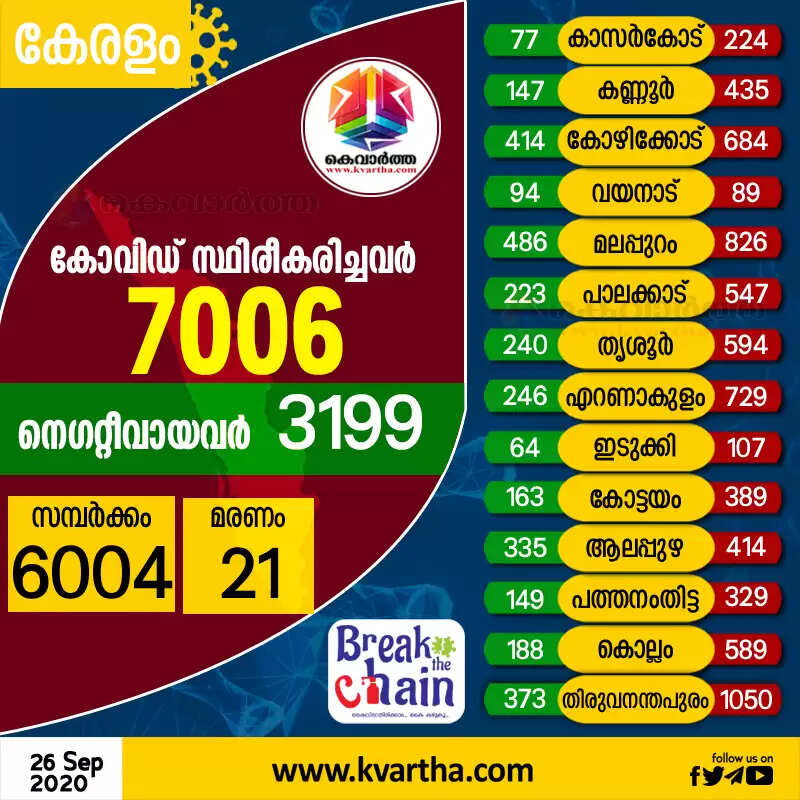 തിരുവനന്തപുരം: (www.kvartha.com 26.09.2020) സംസ്ഥാനത്ത് ശനിയാഴ്ച കോവിഡ് സ്ഥിരീകരിച്ചത് 7006 പേര്ക്ക്. കഴിഞ്ഞ രണ്ട് ദിവസങ്ങളിലായി കോവിഡ് സംഖ്യ ആറായിരം കടന്നിരുന്നു. കഴിഞ്ഞദിവസം 6477 പേര്ക്കായിരുന്നു കോവിഡ് സ്ഥിരീകരിച്ചത്.
