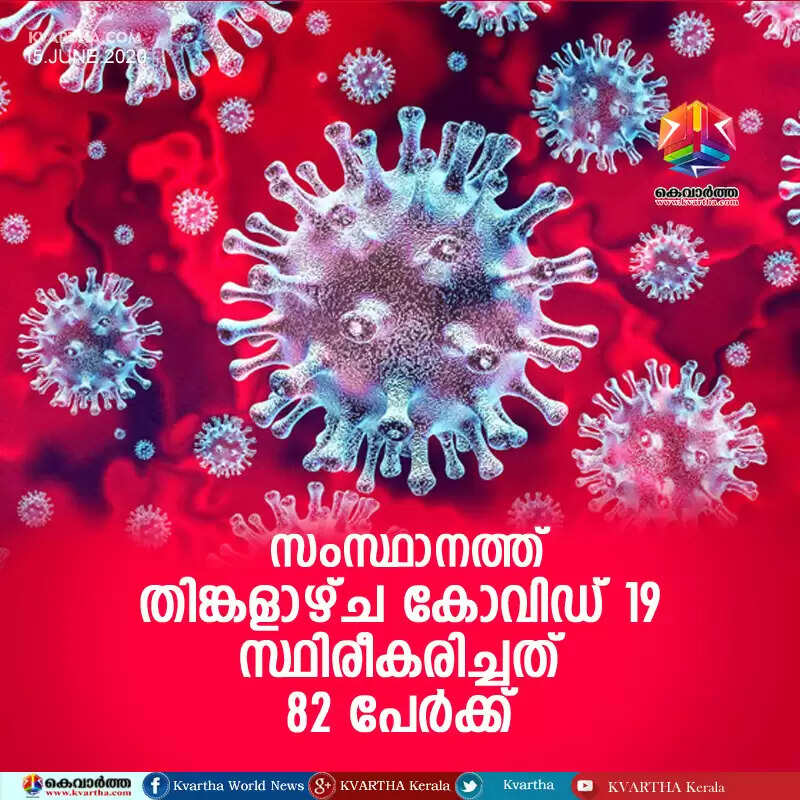 തിരുവനന്തപുരം: (www.kvartha.com 15.06.2020) സംസ്ഥാനത്ത് തിങ്കളാഴ്ച 82 പേര്ക്കാണ് കോവിഡ്-19 സ്ഥിരീകരിച്ചത്. എറണാകുളം ജില്ലയില് 13 പേര്ക്കും, പത്തനംതിട്ട ജില്ലയില് 11 പേര്ക്കും, കോട്ടയം, കണ്ണൂര് ജില്ലകളില് 10 പേര്ക്ക് വീതവും, പാലക്കാട് ജില്ലയില് 7 പേര്ക്കും, മലപ്പുറം, കോഴിക്കോട് ജില്ലകളില് 6 പേര്ക്ക് വീതവും, ആലപ്പുഴ ജില്ലയില് 5 പേര്ക്കും, കൊല്ലം ജില്ലയില് 4 പേര്ക്കും, തൃശ്ശൂര്, കാസര്കോട് ജില്ലകളില് 3 പേര്ക്ക് വീതവും, ഇടുക്കി ജില്ലയില് 2 പേര്ക്കും, തിരുവനന്തപുരം ( ജൂണ് 12 ന് മരണമടഞ്ഞത് ), വയനാട് ജില്ലകളില് നിന്നുള്ള ഒരാള്ക്ക് വീതവുമാണ് രോഗം സ്ഥിരീകരിച്ചത്.