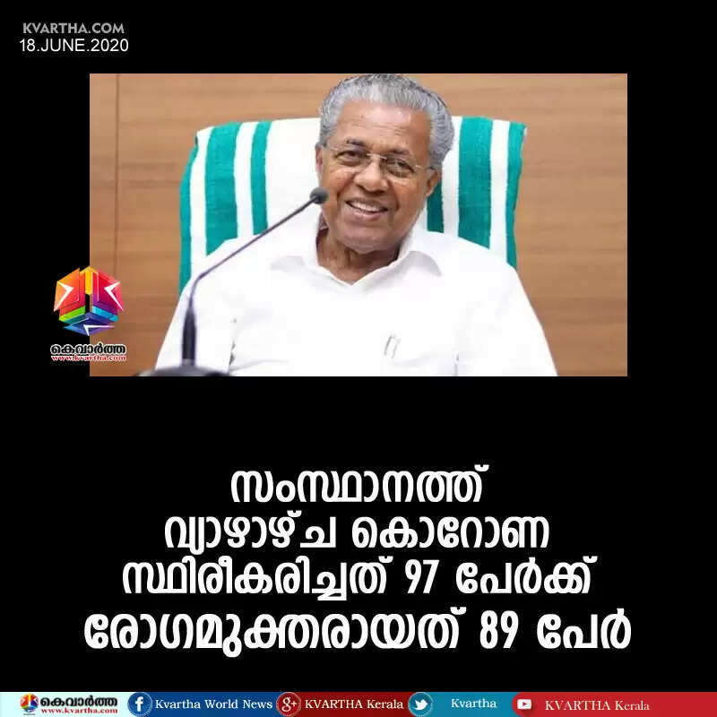 തിരുവനന്തപുരം: (www.kvartha.com 18.06.2020) സംസ്ഥാനത്ത് വ്യാഴാഴ്ച കൊറോണ സ്ഥിരീകരിച്ചത് 97 പേര്‍ക്ക്. രോഗമുക്തരായത് 89പേര്‍. രോഗം ബാധിച്ചവരില്‍ 65 പേര്‍ വിദേശത്ത് നിന്ന് വന്നവരാണ്. 29 പേര്‍ മറ്റ് സംസ്ഥാനങ്ങളില്‍ നിന്ന് വന്നവരാണ്. മൂന്നുപേര്‍ക്ക് സമ്പര്‍ക്കത്തിലൂടെ രോഗം പകര്‍ന്നു. മുഖ്യമന്ത്രി പിണറായി വിജയന്‍ വാര്‍ത്താസമ്മേളനത്തില്‍ അറിയിച്ചതാണ് ഇക്കാര്യം.