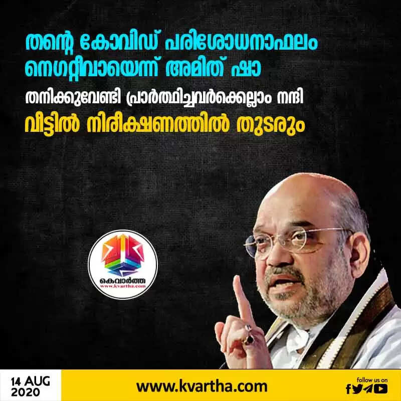 തന്റെ കോവിഡ് പരിശോധനാഫലം നെഗറ്റീവായെന്ന് അമിത് ഷാ ; തനിക്കുവേണ്ടി പ്രാര്ത്ഥിച്ചവര്ക്കെല്ലാം നന്ദി; വീട്ടില് നിരീക്ഷണത്തില് തുടരും
