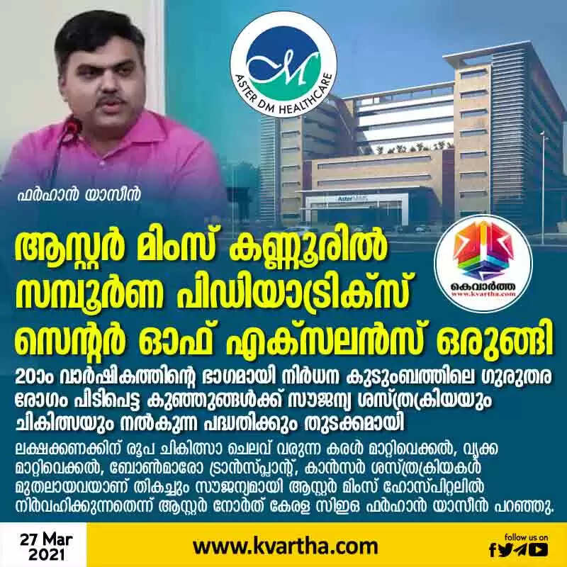കണ്ണൂര് ആസ്റ്റര് മിംസില് സമ്പൂര്ണ പിഡിയാട്രിക്സ് സെന്റര് ഓഫ് എക്സലന്സ് ഒരുങ്ങി; 20-ാം വാര്ഷികത്തിന്റെ ഭാഗമായി നിര്ധന കുടുംബത്തിലെ ഗുരുതര രോഗം പിടിപെട്ട കുഞ്ഞുങ്ങള്ക്ക് സൗജന്യ ശസ്ത്രക്രിയയും ചികിത്സയും നല്കുന്ന പദ്ധതിക്കും തുടക്കമായി