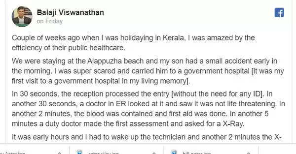'ആകെ ചെലവായത് 20 മിനുട്ടും പൂജ്യം രൂപയും, അവിടെ ഞങ്ങള്ക്ക് അറിയാവുന്ന ആള്ക്കാരില്ല, സ്വാധീനമില്ല, പണമില്ല, ഭാഷ പോലും അറിയില്ല. ഇതുപോലൊരു സംവിധാനം ലോകത്ത് മറ്റെവിടേയും ഞാന് കണ്ടിട്ടില്ല'. ഇങ്ങനെയാണ് കേരളത്തിലെ ഒരു സര്ക്കാര് ആശുപത്രിയില് പോയപ്പോഴുണ്ടായ നല്ല അനുഭവം ബാലാജി വിശ്വനാഥ് പങ്കുവെച്ചത്.
