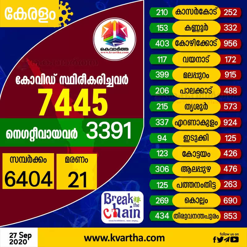 തിരുവനന്തപുരം: (www.kvartha.com 27.09.2020) സംസ്ഥാനത്ത് ഞായറാഴ്ച കോവിഡ് സ്ഥിരീകരിച്ചത് 7445 പേര്ക്ക്. കഴിഞ്ഞദിവസം കോവിഡ് സംഖ്യ 7006 ആയിരുന്നു.
