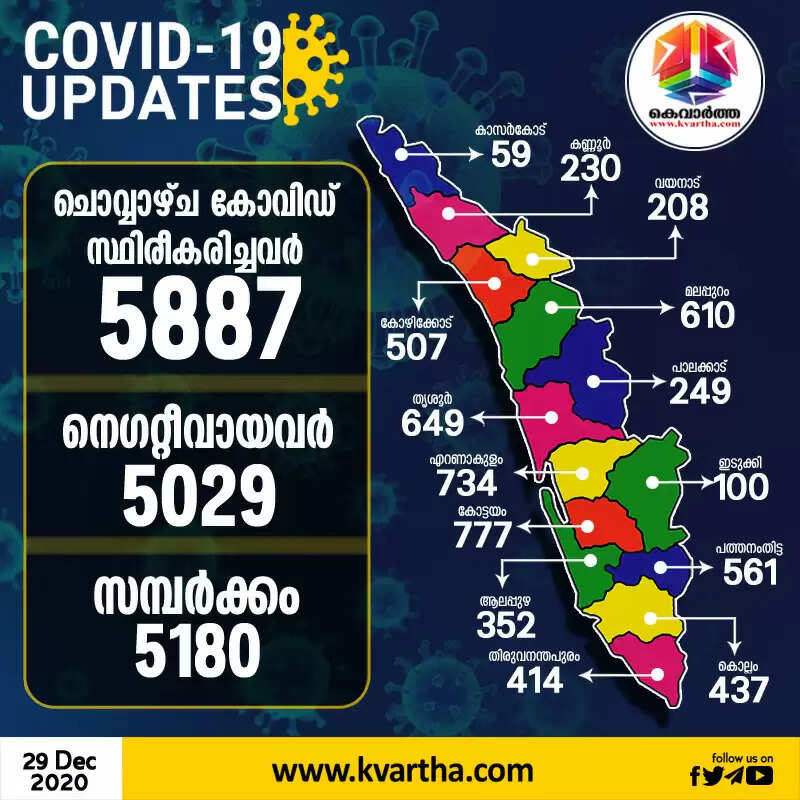 തിരുവനന്തപുരം: (www.kvartha.com 29.12.2020) സംസ്ഥാനത്ത് ചൊവ്വാഴ്ച കോവിഡ് സ്ഥിരീകരിച്ചത് 5887 പേര്ക്ക്. കഴിഞ്ഞദിവസം 3047പേര്ക്കാണ് കോവിഡ് സ്ഥിരീകരിച്ചത്.