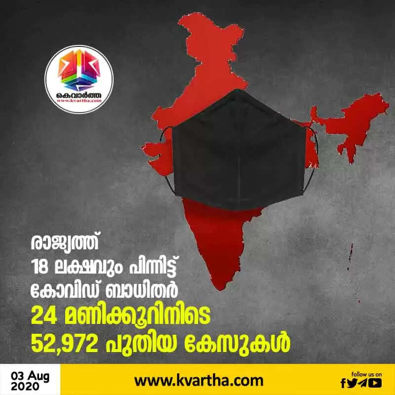 രാജ്യത്ത് 18 ലക്ഷവും പിന്നിട്ട് കോവിഡ് ബാധിതര്‍; 24 മണിക്കൂറിനിടെ 52,972 പുതിയ കേസുകള്‍