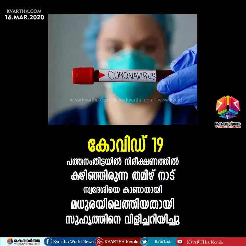 കോവിഡ്-19: പത്തനംതിട്ടയില് നിരീക്ഷണത്തില് കഴിഞ്ഞിരുന്ന തമിഴ് നാട് സ്വദേശിയെ കാണാതായി; മധുരയിലെത്തിയതായി സുഹൃത്തിനെ വിളിച്ചറിയിച്ചു