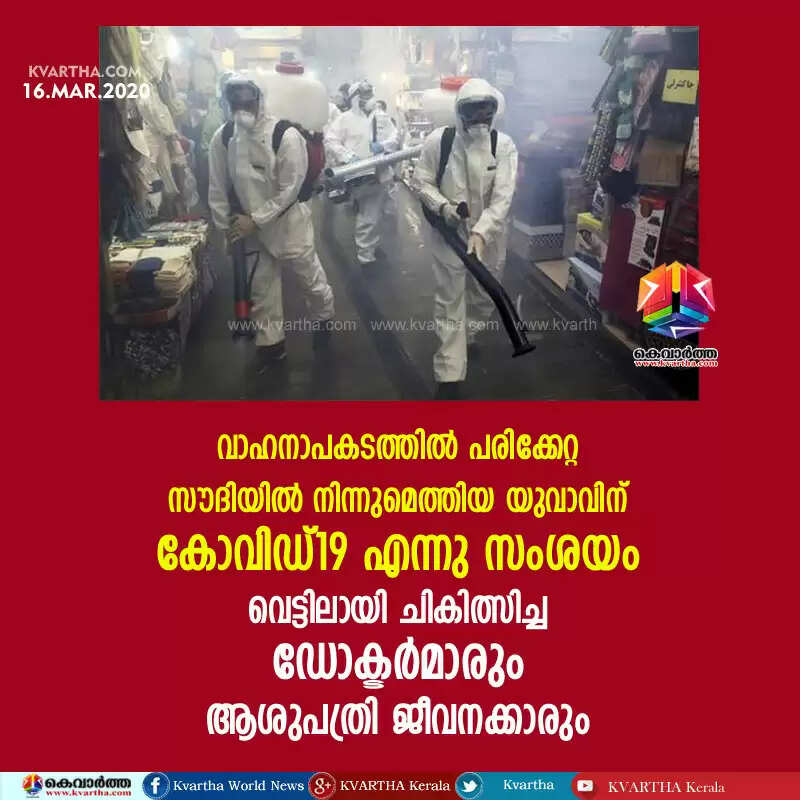 വാഹനാപകടത്തില് പരിക്കേറ്റ സൗദിയില് നിന്നുമെത്തിയ യുവാവിന് കോവിഡ്19 എന്നു സംശയം; വെട്ടിലായി ചികിത്സിച്ച ഡോക്ടര്മാരും ആശുപത്രി ജീവനക്കാരും