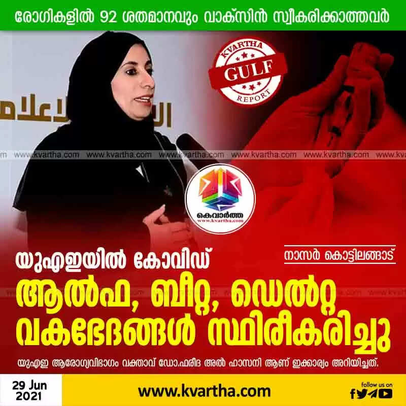 വാക്സിൻ സ്വീകരിക്കുന്നതിന്റെ ആവശ്യകത വ്യക്തമാക്കിയാണ് ദേശീയ അടിയന്തര ദുരന്ത നിവാരണ അതോറിറ്റി വാർത്താസമ്മേളനം നടത്തിയത്. പുതിയ കോവിഡ് രോഗികളിൽ 39.2 ശതമാനം പേരിൽ ബീറ്റ വകഭേദം സ്ഥിരീകരിച്ചു. 33.9 ശതമാനംപേരിൽ ഡെൽറ്റയും 11.3 ശതമാനം പേരിൽ ആൽഫ വകഭേദവുമാണ് സ്ഥിരീകരിച്ചതെന്ന് യുഎഇ ആരോഗ്യവിഭാഗം വക്താവ് ഡോ.ഫരീദ അൽ ഹാസനി അറിയിച്ചു