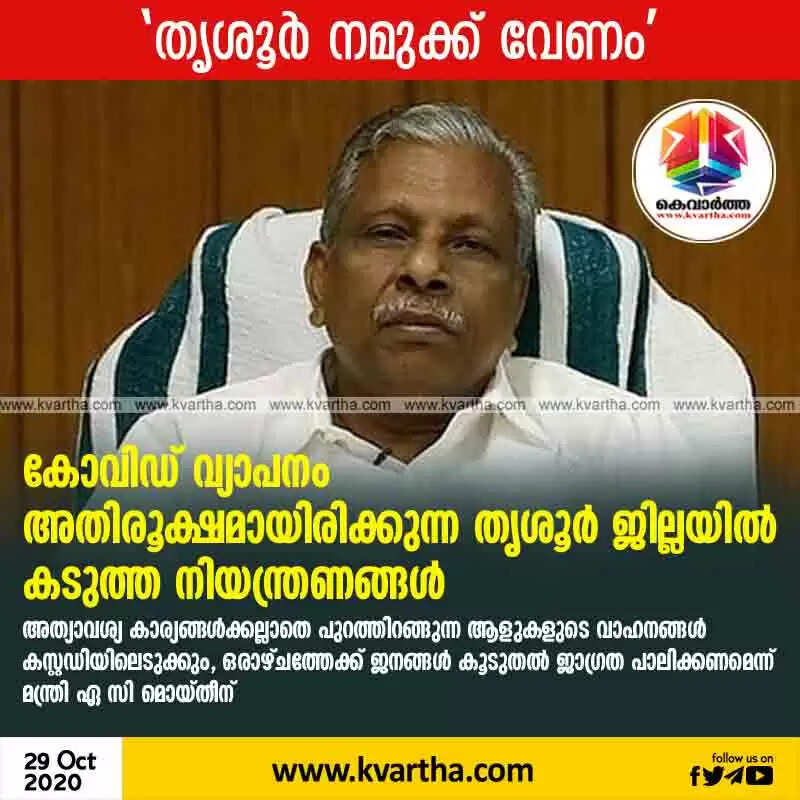 കോവിഡ് വ്യാപനം അതിരൂക്ഷമായിരിക്കുന്ന തൃശൂര് ജില്ലയില് കടുത്ത നിയന്ത്രണങ്ങള്; അത്യാവശ്യ കാര്യങ്ങള്ക്കല്ലാതെ പുറത്തിറങ്ങുന്ന ആളുകളുടെ വാഹനങ്ങള് കസ്റ്റഡിയിലെടുക്കും, ഒരാഴ്ചത്തേക്ക് ജനങ്ങള് കൂടുതല് ജാഗ്രത പാലിക്കണമെന്ന് മന്ത്രി ഏ സി മൊയ്തീന്