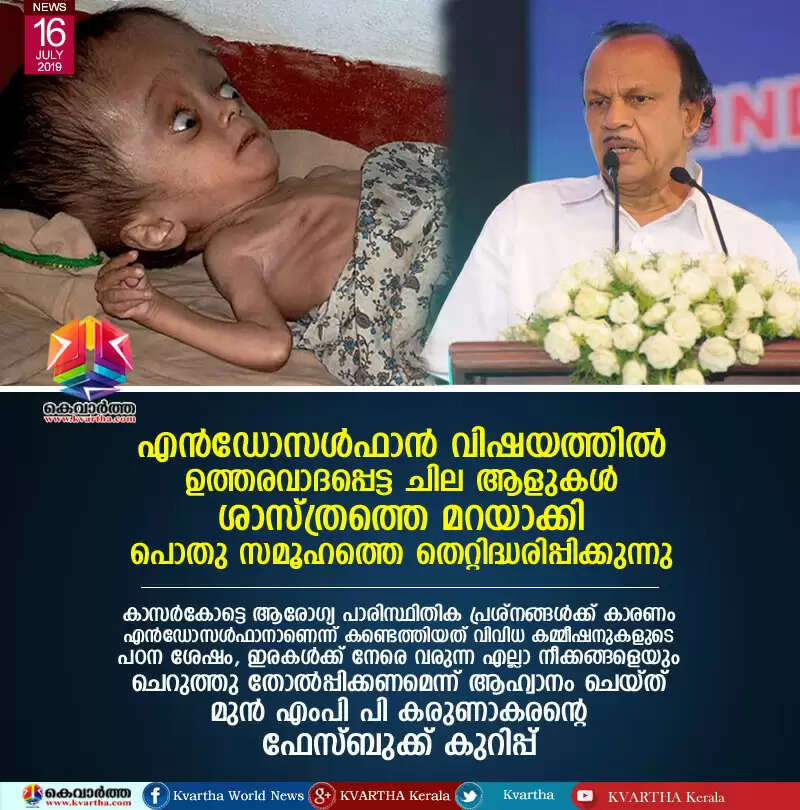എന്ഡോസള്ഫാന് വിഷയത്തില് ഉത്തരവാദപ്പെട്ട ചില ആളുകള് ശാസ്ത്രത്തെ മറയാക്കി പൊതു സമൂഹത്തെ തെറ്റിദ്ധരിപ്പിക്കുന്നു; കാസര്കോട്ടെ ആരോഗ്യ- പാരിസ്ഥിതിക പ്രശ്നങ്ങള്ക്ക് കാരണം എന്ഡോസള്ഫാനാണെന്ന് കണ്ടെത്തിയത് വിവിധ കമ്മീഷനുകളുടെ പഠന ശേഷം, ഇരകള്ക്ക് നേരെ വരുന്ന എല്ലാ നീക്കങ്ങളെയും ചെറുത്തു തോല്പ്പിക്കണമെന്ന് ആഹ്വാനം ചെയ്ത് മുന് എംപി പി കരുണാകരന്റെ ഫേസ്ബുക്ക് കുറിപ്പ്