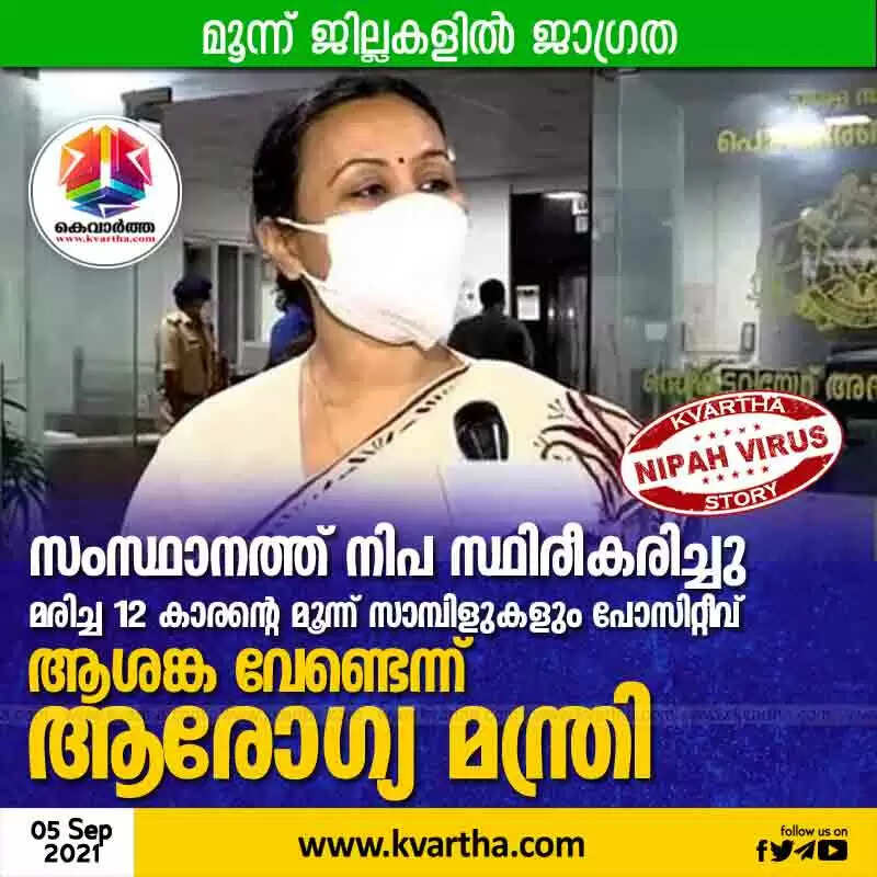 സംസ്ഥാനത്ത് നിപ സ്ഥിരീകരിച്ചു; മരിച്ച 12 കാരന്റെ 3 സാമ്പിളുകളും പോസിറ്റീവ്; ആശങ്ക വേണ്ടെന്ന് ആരോഗ്യ മന്ത്രി, 3 ജില്ലകളില് ജാഗ്രത