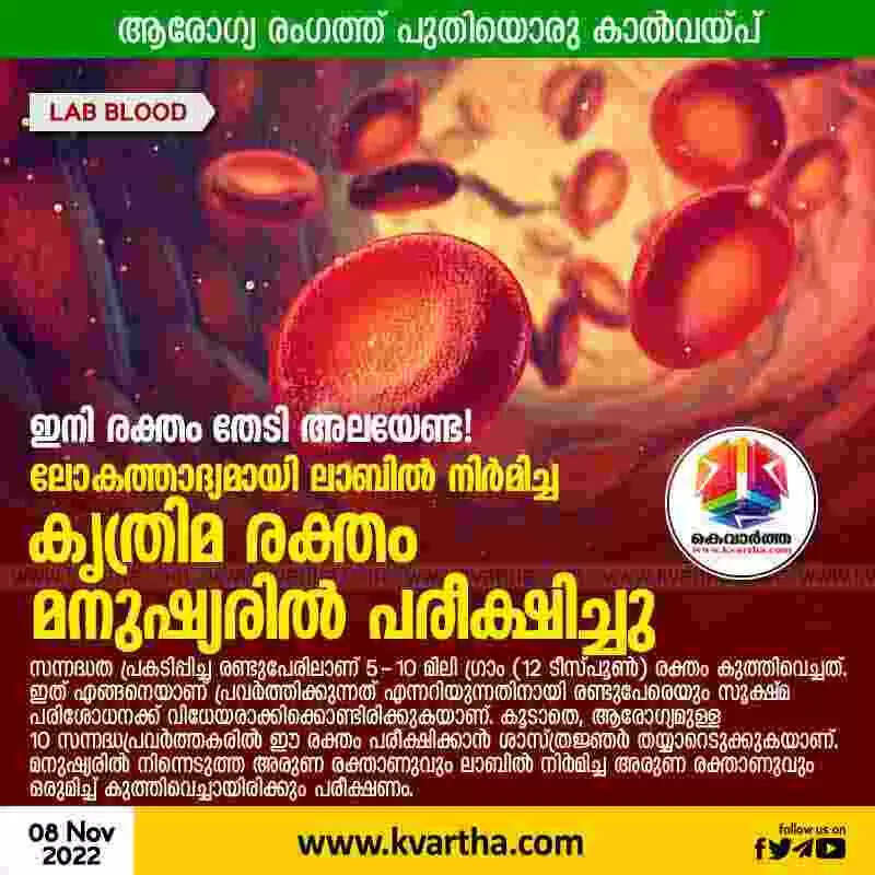 Lab blood | ഇനി രക്തം തേടി അലയേണ്ട! ലോകത്താദ്യമായി ലാബിൽ നിർമിച്ച കൃത്രിമ രക്തം മനുഷ്യരിൽ പരീക്ഷിച്ചു; ആരോഗ്യ രംഗത്ത് പുതിയൊരു കാൽവയ്പ്