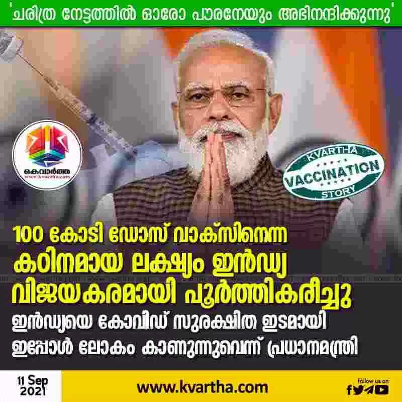 100 കോടി ഡോസ് വാക്സിനെന്ന കഠിനമായ ലക്ഷ്യം ഇന്ഡ്യ വിജയകരമായി പൂര്ത്തികരീച്ചു; ചരിത്ര നേട്ടത്തില് ഓരോ പൗരനേയും അഭിനന്ദിക്കുന്നു, ഇന്ഡ്യയെ കോവിഡ് സുരക്ഷിത ഇടമായി ഇപ്പോള് ലോകം കാണുന്നുവെന്ന് പ്രധാനമന്ത്രി
