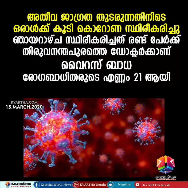 അതീവ ജാഗ്രത തുടരുന്നതിനിടെ ഒരാൾക്ക് കൂടി കൊറോണ സ്ഥിരീകരിച്ചു; ഇന്ന് സ്ഥിരീകരിച്ചത് രണ്ട് പേര്ക്ക്, തിരുവനന്തപുരത്തെ ഡോക്ടർക്കാണ് വൈറസ് ബാധ, രോഗബാധിതരുടെ എണ്ണം 21 ആയി
