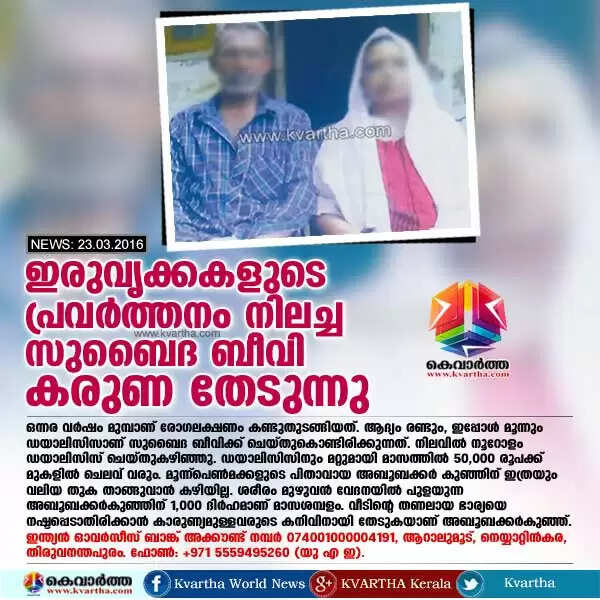 തിരുവനന്തപുരം: (www.kvartha.com 23/03/2016) ഇരുവൃക്കകളുടെയും പ്രവര്‍ത്തനം നിലച്ച സുബൈദ ബീവി കാരുണ്യമുള്ളവരുടെ കരുണ തേടുന്നു. തിരുവനന്തപുരം ജില്ലയിലെ നെയ്യാറ്റിന്‍കര അറാലമൂട് സ്വദേശിയും അബുദാബി അല്‍ കയ്യാം ബേക്കറി തൊഴിലാളിയുമായ അബൂബക്കര്‍ കുഞ്ഞിന്റെ ഭാര്യയുമായ സുബൈദ ബീവിയുടെ ഇരുവൃക്കകളും പ്രവര്‍ത്തനം നിലച്ചിട്ട് വര്‍ഷം ഒന്ന് പൂര്‍ത്തിയായി.