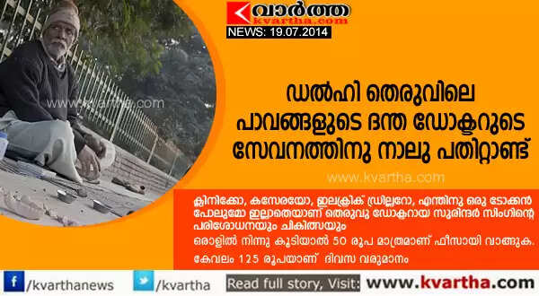 ന്യൂഡല്‍ഹി: (www.kvartha.com 19.07.2014) രാജ്യ തലസ്ഥാനത്തെ റോഡരികിലിരുന്ന് പല്ലു പറിക്കുകയും പുതിയ പല്ലു വെച്ചു കൊടുക്കുകയും ചെയ്യുന്ന 'പാവങ്ങളുടെ ദന്ത ഡോക്ടര്‍' സേവത്തില്‍ നാലു ദശാബ്ദം തികയ്ക്കുന്നു. ക്ലിനിക്കോ, കസേരയോ, ഇലക്ട്രിക് ഡ്രില്ലറോ, എന്തിനു ഒരു ടോക്കന്‍ പോലുമോ ഇല്ലാതെയാണ് തെരുവു ഡോക്ടറായ സുരിന്ദര്‍ സിംഗിന്റെ പരിശോധനയും ചികിത്സയും. പഞ്ചാബിലെ ലുധിയാന സ്വദേശിയായ 67 കാരനായ ഇദ്ദേഹത്തിന്റെ രോഗികളിലേറെയും പാവപ്പെട്ടവരാണ്.