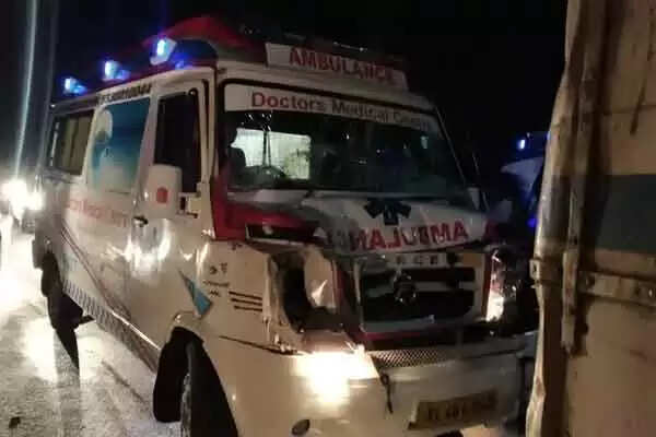 വെളപ്പായ റോഡ് ജംഗ്ഷനില്‍ മുളങ്കുന്നത്തുകാവ് പഞ്ചായത്ത് ഓഫിസിനടുത്ത് ബൈക് യാത്രികനെ രക്ഷിക്കാന്‍ ബസ് പെട്ടെന്ന് ബ്രേക് ചെയ്തപ്പോള്‍ ആംബുലന്‍സ് ഇടിക്കുകയായിരുന്നെന്ന് പൊലീസ് പറഞ്ഞു. ആംബുലന്‍സിന്റെ മുന്‍ഭാഗം തകര്‍ന്നു.