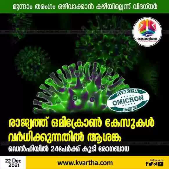 ന്യൂഡെല്‍ഹി: (www.kvartha.com 22.12.2021) രാജ്യത്ത് ഒമിക്രോണ്‍ കേസുകള്‍ വര്‍ധിക്കുന്നതില്‍ ആശങ്ക. ന്യൂഡെല്‍ഹിയില്‍ 24 പേര്‍ക്ക് കൂടി കോവിഡിന്റെ പുതിയ ഒമിക്രോണ്‍ വകഭേദം സ്ഥിരീകരിച്ചു. കോവിഡ് മൂന്നാം തരംഗം ഒഴിവാക്കാന്‍ കഴിയില്ലെന്ന് വിദഗ്ധര്‍ അഭിപ്രായപ്പെട്ടു.