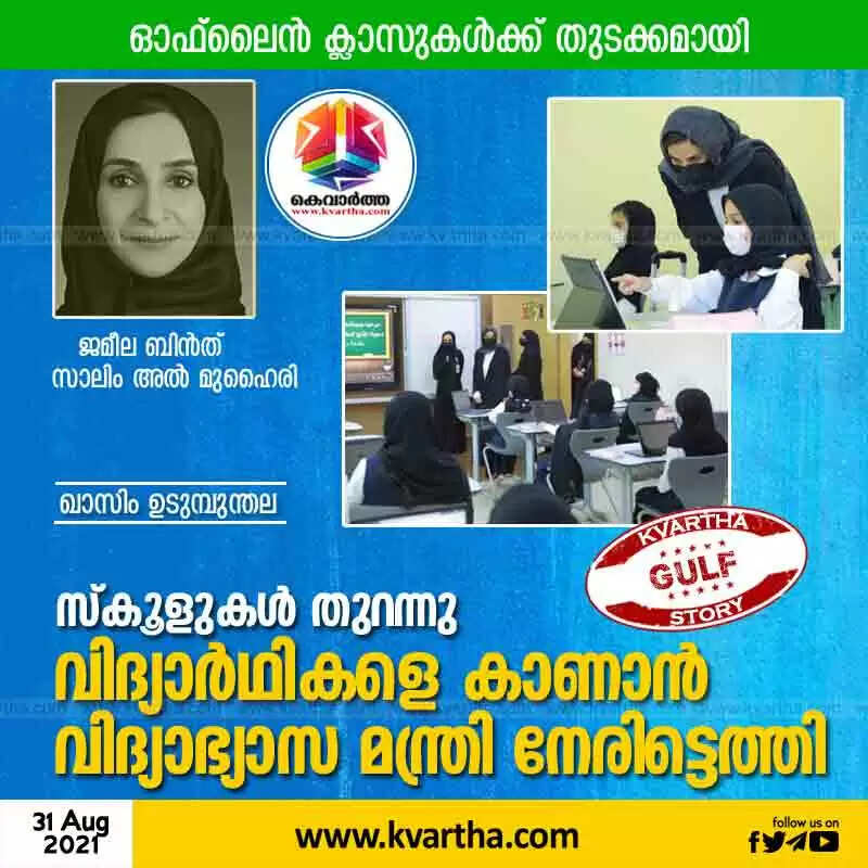 ശാര്ജ: (www.kvartha.com 31.08.2021) ഒന്നര വര്ഷത്തിലേറെ നീണ്ട ഇടവേളയ്ക്കുശേഷം സ്കൂളുകളില് നേരിട്ട് പഠനത്തിനെത്തിയ വിദ്യാര്ഥികളെ കാണാന് യു എ ഇ മന്ത്രിയുമെത്തി. യു എ ഇ പൊതു വിദ്യാഭ്യാസ സഹമന്ത്രി ജമീല ബിന്ത് സാലിം അല് മുഹൈരിയാണ് ശാര്ജ, അജ്മാന്, ഉമ്മുല് ഖുവൈന് എന്നീ എമിറേറ്റുകളിലെ നാലു സ്കൂളുകളില് അപ്രതീക്ഷിത സന്ദര്ശനം നടത്തിയത്.