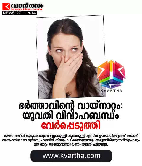 കയ്റോ: (www.kvartha.com 27.11.2014) വിവാഹബന്ധം വേര്പ്പെടുത്താന് നിരവധി കാരണങ്ങള് പലരും പറയുന്നത് കേട്ടിട്ടില്ലേ? എന്നാല് ഈജിപ്തിലെ കുടുംബകോടതിയില് വന്ന ഒരു വിവാഹമോചനകേസില് പരാതിക്കാരിയായ യുവതി തന്റെ ഭര്ത്താവില് നിന്ന് മോചനം ലഭിക്കാന് ഉന്നയിക്കുന്ന രസകരമായ കാരണം ഇതാ കേട്ടുനോക്കൂ., ഭര്ത്താവിന്റെ വായിലെ ചീഞ്ഞ നാറ്റം സഹിക്കാനാവാത്തതുകൊണ്ട് വിവാഹബന്ധം വേര്പ്പെടുത്തിത്തരണം. ഇതാണ് വിവാഹമോചനം ആവശ്യപ്പെട്ടുകൊണ്ടുള്ള ഹര്ജിയില് യുവതി ഉന്നയിക്കുന്ന കാരണം