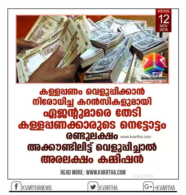 കള്ളപ്പണം വെളുപ്പിക്കാന് നിരോധിച്ച കറന്സികളുമായി ഏജന്റുമാരെ തേടി കള്ളപ്പണക്കാരുടെ നെട്ടോട്ടം; രണ്ടുലക്ഷം അക്കൗണ്ടിലിട്ട് വെളുപ്പിച്ചാല് അരലക്ഷം കമ്മിഷന്
