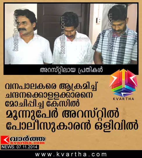 വനപാലകരെ ആക്രമിച്ച് ചന്ദനക്കൊളളക്കാരനെ മോചിപ്പിച്ച കേസില് മൂന്നുപേര് അറസ്റ്റില് പോലീസുകാരന് ഒളിവില്