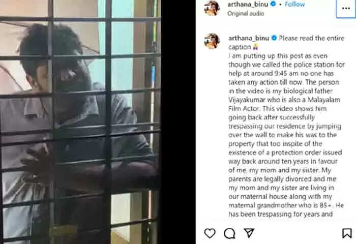 തിരുവനന്തപുരം: (www.kvartha.com) നടന് വിജയകുമര് വീട്ടില് അതിക്രമിച്ച് കയറി വധഭീഷണി മുഴക്കിയതായി മകളും നടിയുമായ അര്ഥന ബിനു. മുത്തശ്ശിയെയും സഹോദരിയെയും കൊല്ലുമെന്നാണ് ഭീഷണി മുഴക്കിയത്. വീടിന്റെ വാതില് പൂട്ടിയതിനാല് ജനലിലൂടെയായിരുന്നു നടന്റെ ഭീഷണിയെന്നും അര്ഥന ഇന്സ്റ്റാഗ്രാമില് കുറിച്ചു.