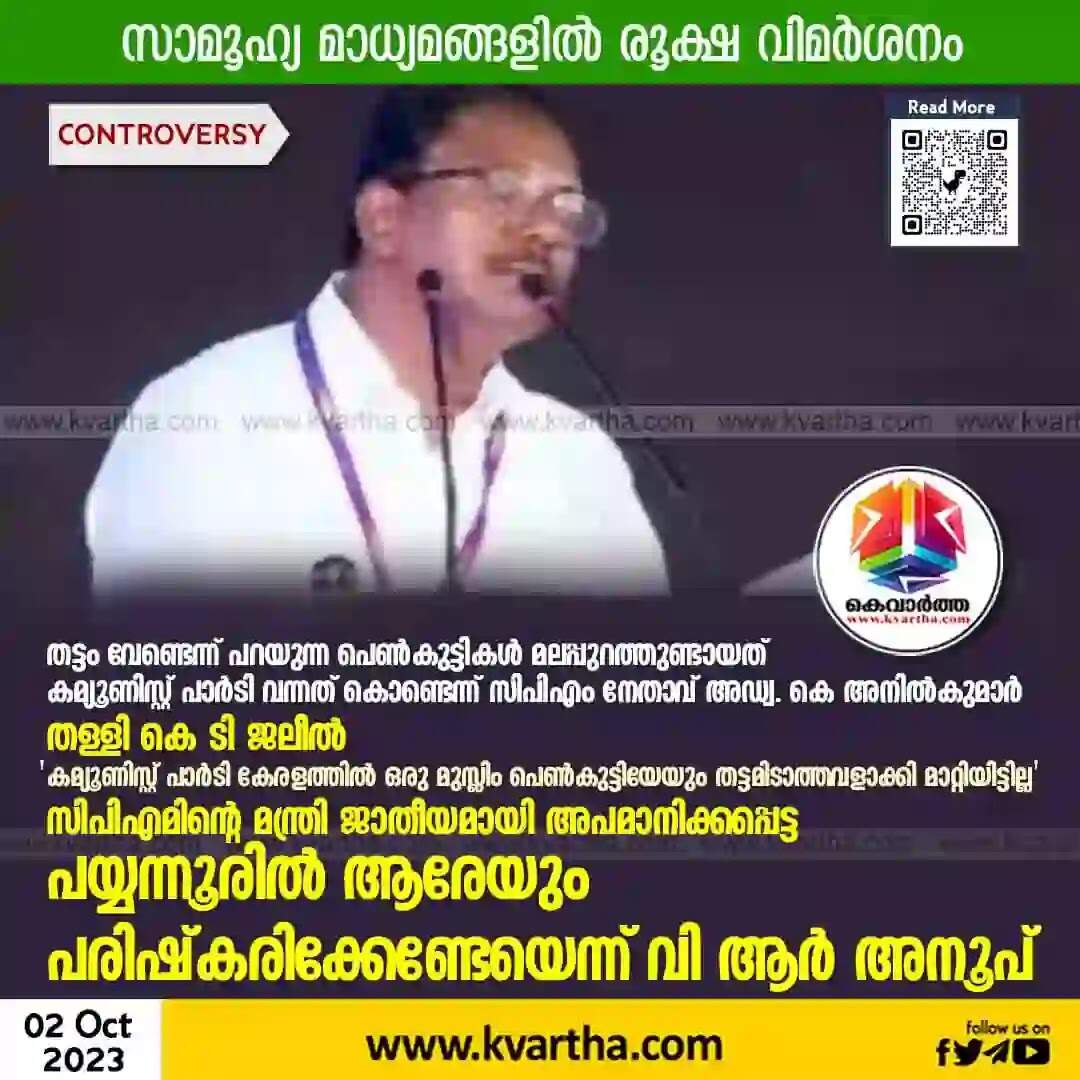 Controversy | തട്ടം വേണ്ടെന്ന് പറയുന്ന പെണ്കുട്ടികള് മലപ്പുറത്തുണ്ടായത് കമ്യൂണിസ്റ്റ് പാര്ടി വന്നത് കൊണ്ടെന്ന് സിപിഎം നേതാവ് അഡ്വ. കെ അനില്കുമാര്; തള്ളി കെ ടി ജലീല്; കമ്യൂണിസ്റ്റ് പാര്ടി കേരളത്തില് ഒരു മുസ്ലിം പെണ്കുട്ടിയേയും തട്ടമിടാത്തവളാക്കി മാറ്റിയിട്ടില്ലെന്ന് മുന് മന്ത്രി; സിപിഎമിന്റെ മന്ത്രി ജാതീയമായി അപമാനിക്കപ്പെട്ട പയ്യന്നൂരില് അനില്കുമാറിന് ആരേയും പരിഷ്കരിക്കേണ്ടേയെന്ന് വി ആര് അനൂപ്; സാമൂഹ്യ മാധ്യമങ്ങളില് രൂക്ഷ വിമര്ശനം