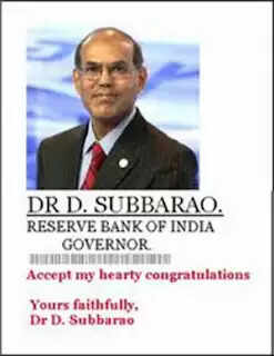 റിസര്വ് ബാങ്ക് ഗവര്ണര് ഡി സുബ്ബറാവുവിന്റെ ചിത്രം ഉപയോഗിച്ച് കഴിഞ്ഞ ദിവസം ഇമെയിലിലെത്തിയ കത്തിലാണ് വാഗ്ദാനം നല്കുന്നത്. റിസര്വ് ബാങ്കിന്റെ ലോഗോയും ഫയല് നമ്പര് പോലുമുള്ളതിനാല് പലരും തെറ്റിദ്ധരിക്കപ്പെടുകയും വിശ്വസിക്കുകയും പണം കിട്ടുന്നതിന് ശ്രമം നടത്തിവരികയുമാണ് ചെയ്യുന്നത്. ബ്രിട്ടനിലെ യു.എന് സെക്രട്ടറി ജനറല് ബാന് കി മൂണും റിസര്വ് ബാങ്ക് ഗവര്ണറും ചേര്ന്ന് നടത്തിയ ചര്ച്ചയിലാണ് പണം വിതരണം ചെയ്യുന്നതെന്ന് പറയുന്നു.