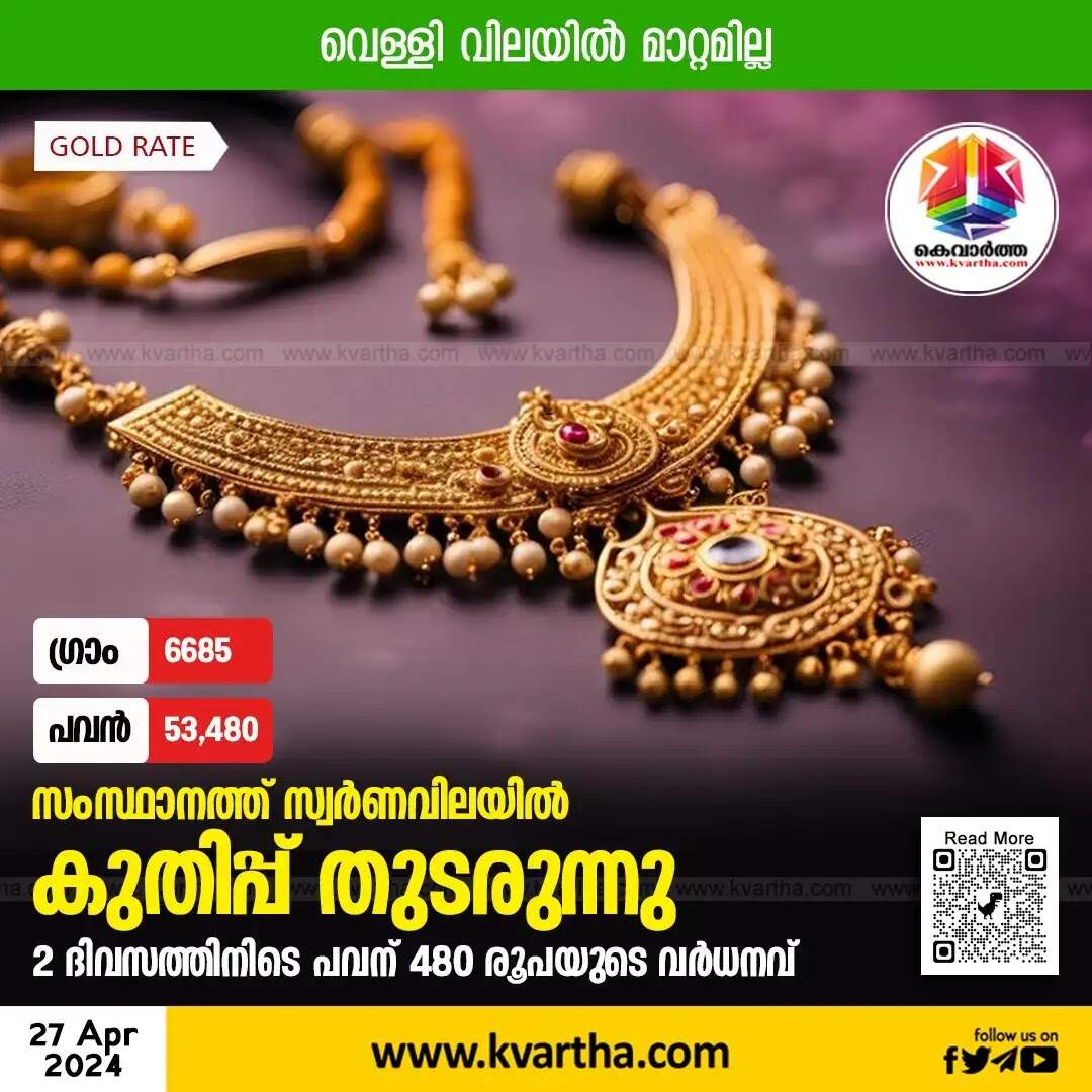 കൊച്ചി: (KVARTHA) സംസ്ഥാനത്ത് സ്വര്ണവിലയില് കുതിപ്പ് തുടരുന്നു. ശനിയാഴ്ച (27.04.2024) ഒരു ഗ്രാം 22 കാരറ്റ് സ്വര്ണത്തിന് 20 രൂപയും ഒരു പവന് 22 കാരറ്റ് സ്വര്ണത്തിന് 160 രൂപയുമാണ് കൂടിയത്. ഒരു ഗ്രാം 22 കാരറ്റ് സ്വര്ണത്തിന് 6685 രൂപയിലും ഒരു പവന് 22 കാരറ്റിന് 53,480 രൂപയിലുമാണ് വ്യാപാരം നടക്കുന്നത്.