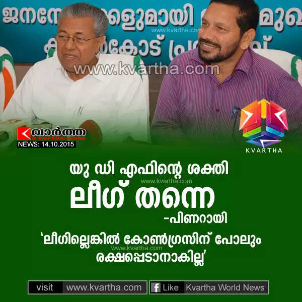 കാസര്‍കോട്: (www.kvartha.com 14/10/2015) യു ഡി എഫിന്റെ ശക്തി കോണ്‍ഗ്രസല്ല മുസ്ലിം ലീഗാണെന്ന് പിണറായി. കാസര്‍കോട് പ്രസ് ക്ലബ്ബില്‍ മാധ്യമപ്രവര്‍ത്തകരുടെ ചോദ്യത്തിന് മറുപടിയായാണ് പിണറായി ഇങ്ങനെ പറഞ്ഞത്.