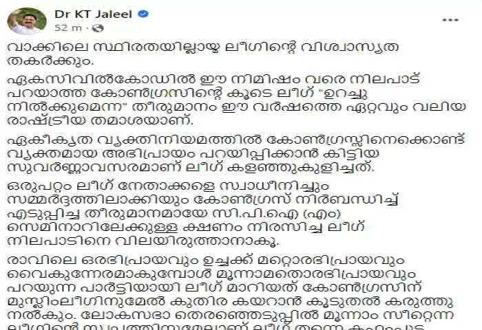 KT Jaleel | വാക്കിലെ സ്ഥിരതയില്ലായ്മ ലീഗിന്റെ വിശ്വാസ്യത തകര്ക്കും; രാവിലെ ഒരഭിപ്രായവും ഉച്ചക്ക് മറ്റൊരഭിപ്രായവും വൈകുന്നേരമാകുമ്പോള് മൂന്നാമതൊരഭിപ്രായവും പറയുന്ന പാര്ടിയായി മാറിയത് കോണ്ഗ്രസിന് കുതിര കയറാന് കൂടുതല് കരുത്തു നല്കുമെന്നും കെ ടി ജലീല്