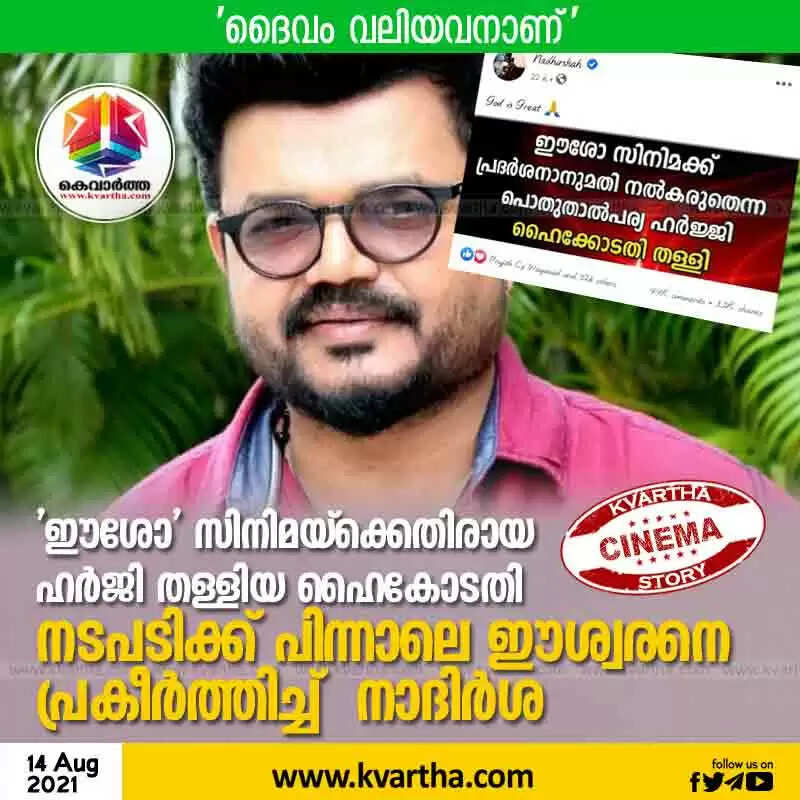 കൊച്ചി: (www.kvartha.com 14.08.2021) 'ഈശോ' സിനിമയ്ക്ക് പ്രദര്ശനാനുമതി നല്കരുതെന്ന് ആവശ്യപ്പെട്ടുള്ള പൊതുതാല്പര്യ ഹര്ജി തള്ളിയ ഹൈകോടതി നടപടിയില് പ്രതികരണവുമായി ചിത്രത്തിന്റെ സംവിധായകന് നാദിര്ശ. 'ദൈവം വലിയവനാണെ'ന്നാണ് ഈ വാര്ത്ത ഫെയ്സ്ബുകില് പങ്കുവച്ചുകൊണ്ട് നാദിര്ശ കുറിച്ചത്.