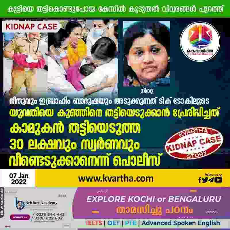 നീതുവും ഇബ്രാഹിം ബാദുഷയും അടുക്കുന്നത് ടിക് ടോകിലൂടെ; യുവതിയെ കുഞ്ഞിനെ തട്ടിയെടുക്കാന് പ്രേരിപ്പിച്ചത് കാമുകന് തട്ടിയെടുത്ത 30 ലക്ഷവും സ്വര്ണവും വീണ്ടെടുക്കാനെന്ന് പൊലീസ്