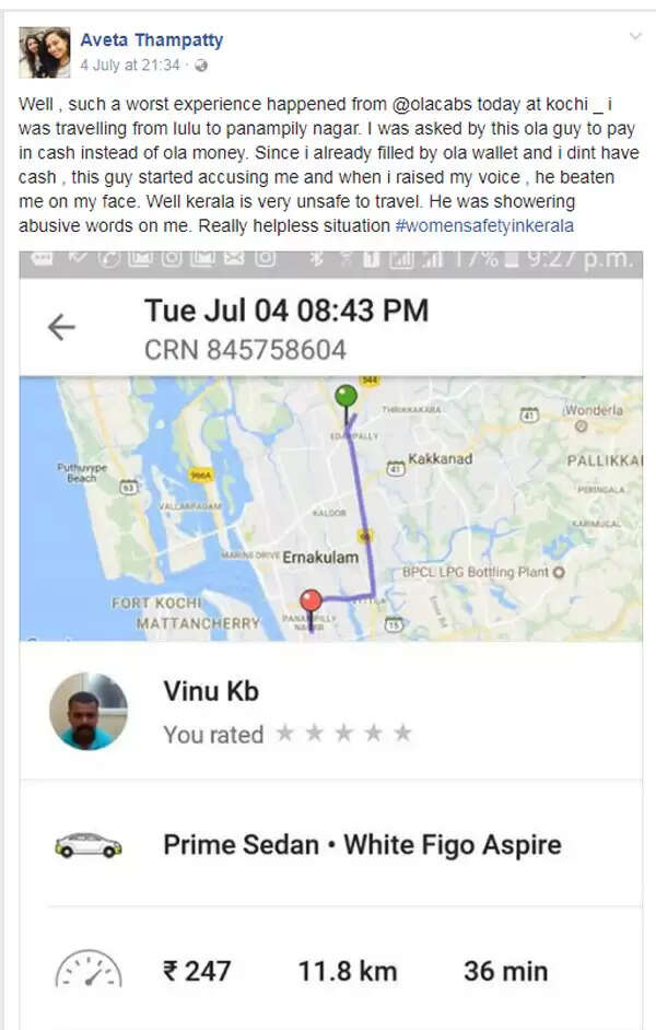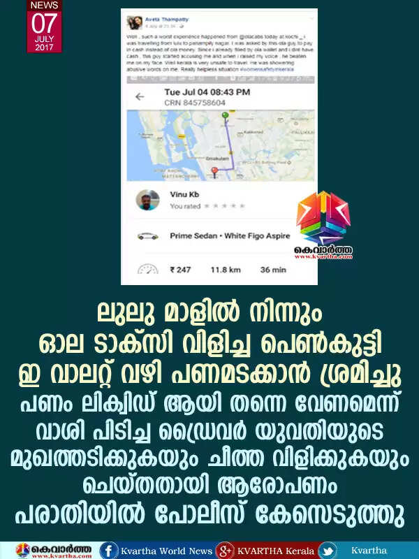 ലുലു മാളിൽ നിന്നും ഓല ടാക്സി വിളിച്ച പെൺകുട്ടി ഇ വാലറ്റ് വഴി പണമടക്കാൻ ശ്രമിച്ചു, പണം ലിക്വിഡ് ആയി തന്നെ വേണമെന്ന് വാശി പിടിച്ച ഡ്രൈവർ യുവതിയുടെ മുഖത്തടിക്കുകയും ചീത്ത വിളിക്കുകയും ചെയ്തതായി ആരോപണം; പരാതിയിൽ പോലീസ് കേസെടുത്തു